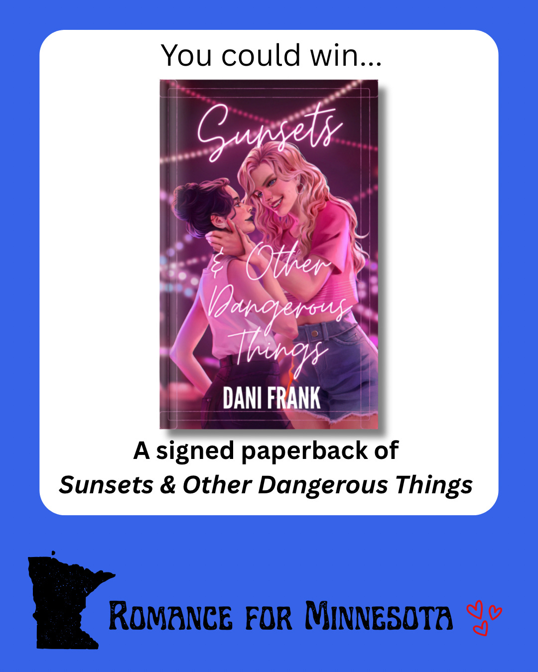 How does it work? Donate to Immigrant Rapid Response Fund, fill out Romance for Minnesota’s entry form, and find out tomorrow (Sunday, Feb 1) if you won one of hundreds of really exciting prizes. Seriously, I looked over the list and it’s mostly signed paperbacks by some really exciting authors like Danica Nava, Alexandra Vast, and Sonali Dev, not to mention some amazing sapphic authors like Kelly Farmer, Rebekah Faubion, and Jenny Lane. A signed copy of Sunsets & Other Dangerous Things is also in the running.